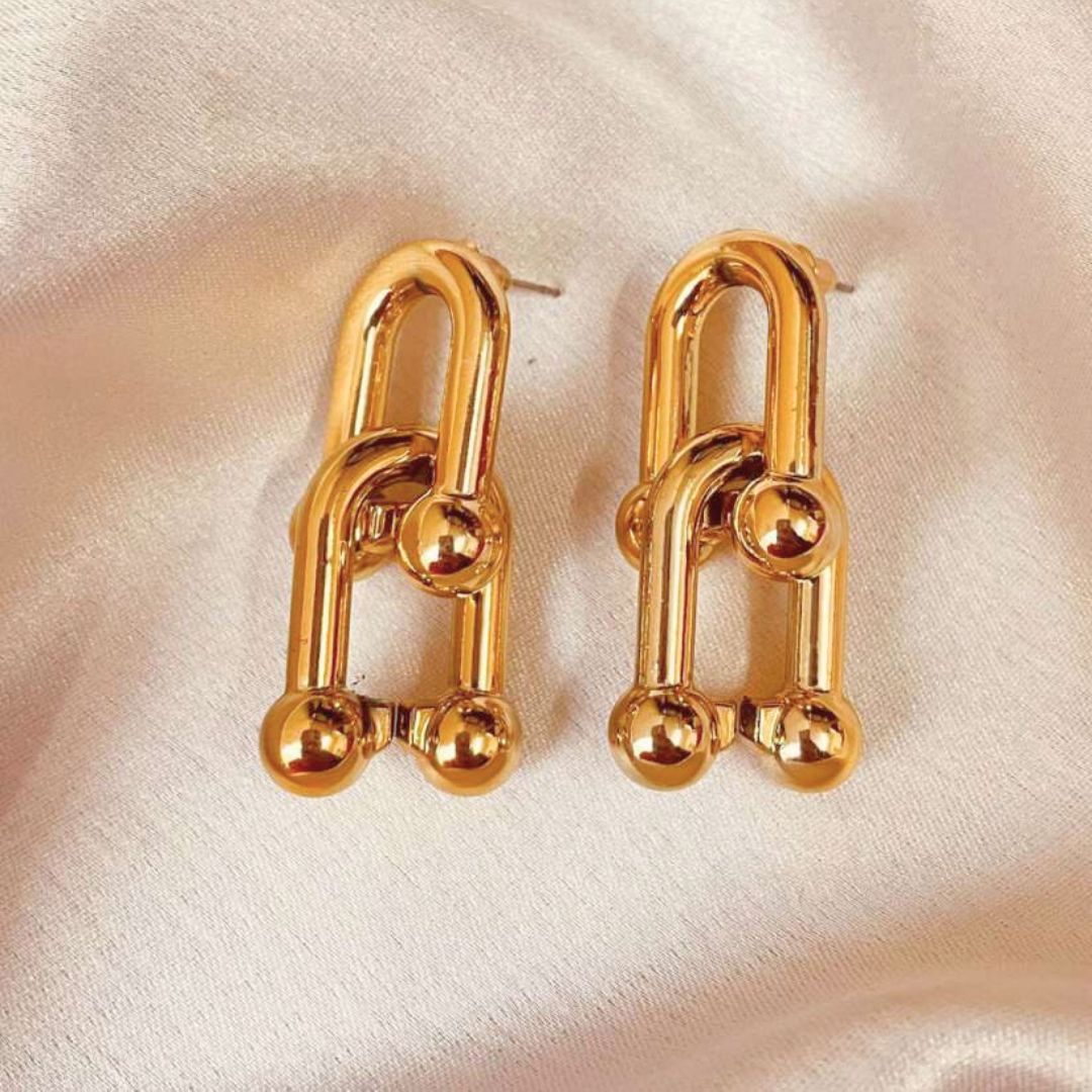 Chunky gold double layer link earrings with a modern geometric design, perfect for making a statement.