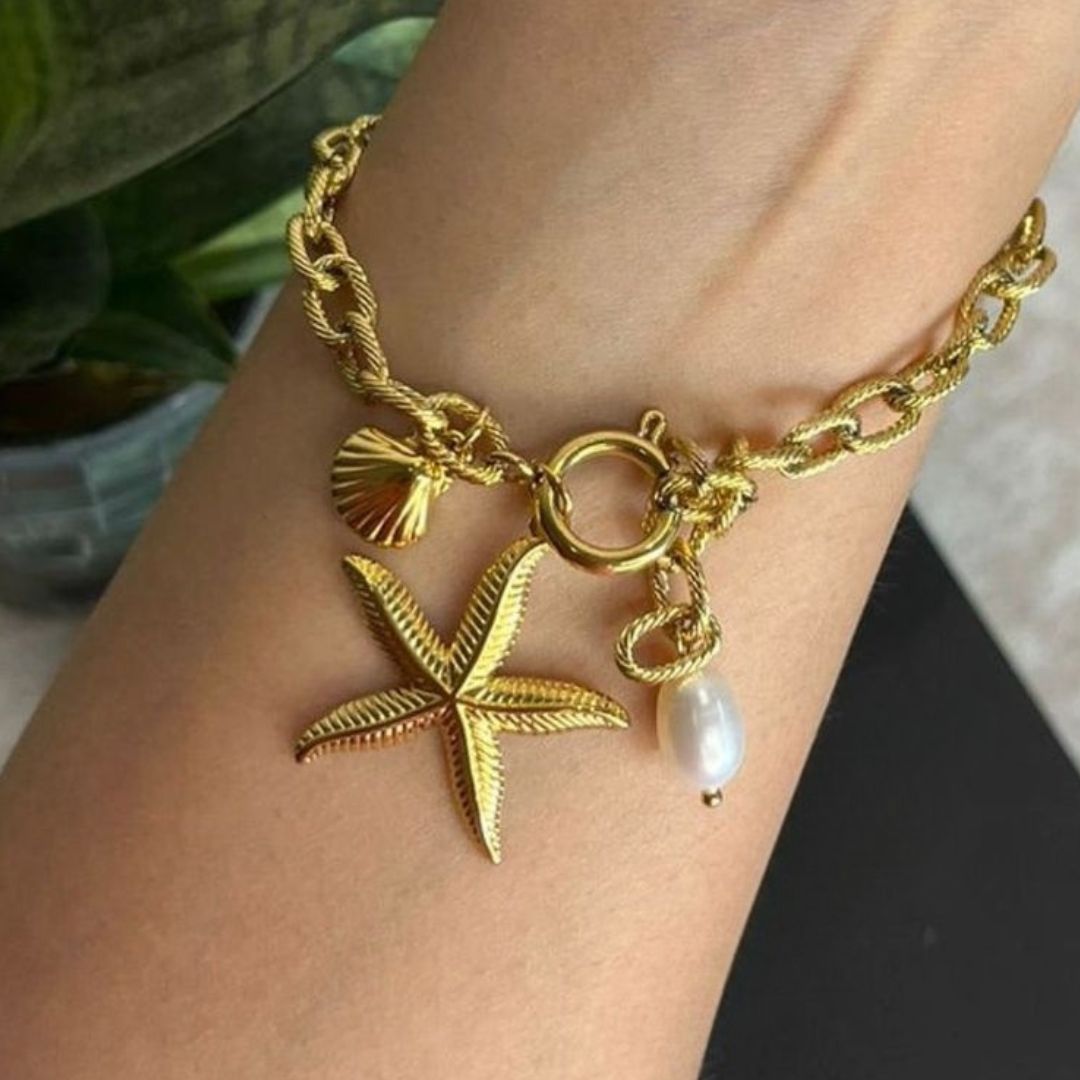 Add a touch of sophistication to your look with this stunning golden charm bracelet. Designed with a sculptural, fluid shape, this bracelet makes a bold yet elegant statement. Its smooth, high-shine finish ensures timeless appeal, perfect for those who love effortless luxury.