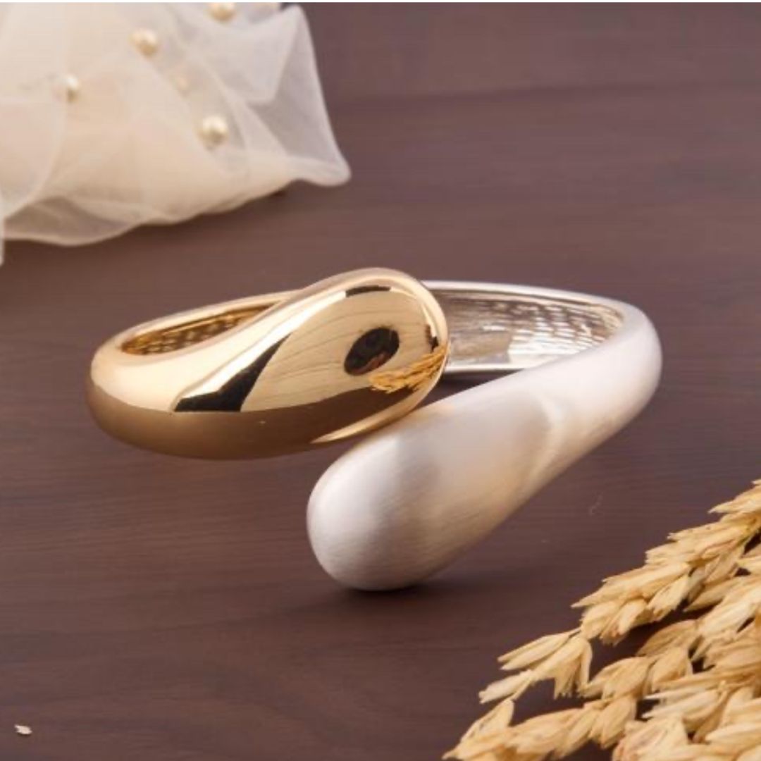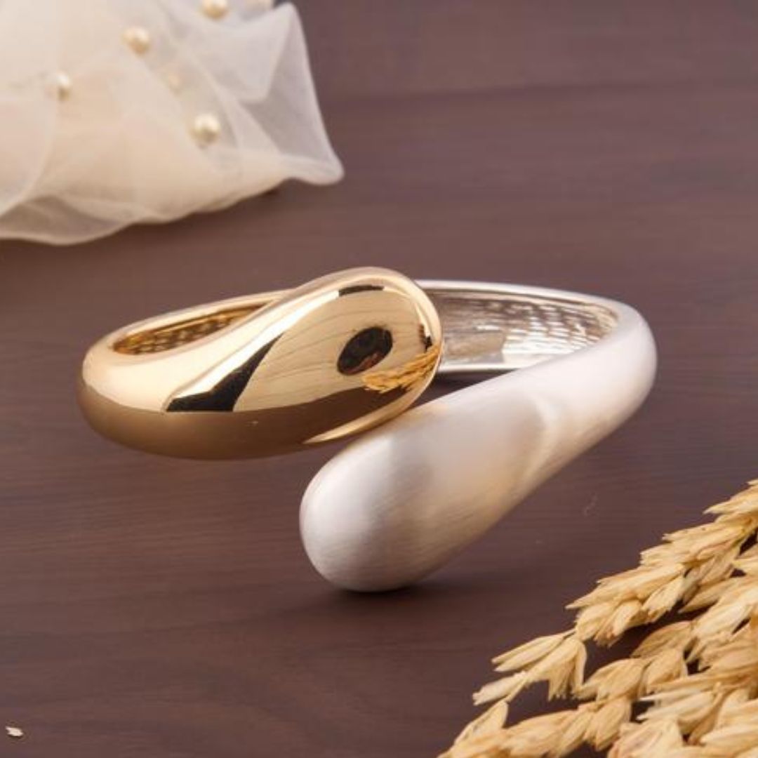 Add a touch of sophistication to your look with this stunning dual-tone solid bangle. Designed with a sculptural, fluid shape, this bracelet makes a bold yet elegant statement. Its smooth, high-shine finish ensures timeless appeal, perfect for those who love effortless luxury.