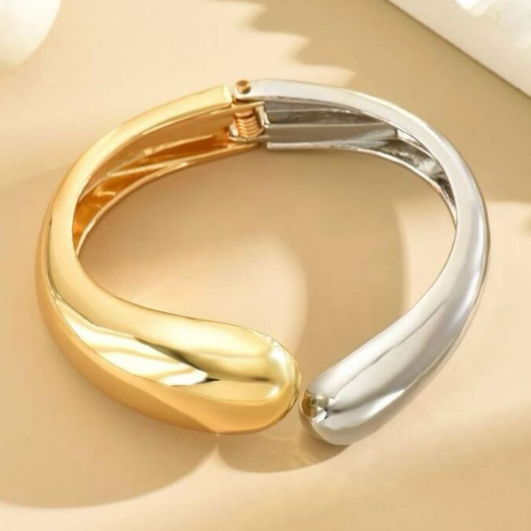 Add a touch of sophistication to your look with this stunning dual-tone solid bangle. Designed with a sculptural, fluid shape, this bracelet makes a bold yet elegant statement. Its smooth, high-shine finish ensures timeless appeal, perfect for those who love effortless luxury.
