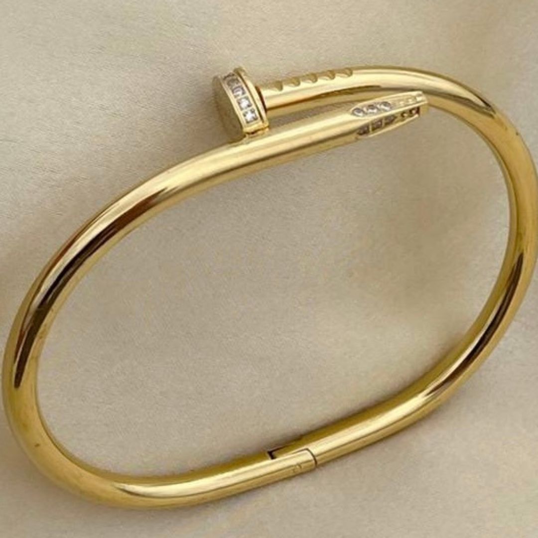 Add a touch of sophistication to your look with this stunning golden bangle. Designed with a sculptural, fluid shape, this bracelet makes a bold yet elegant statement. Its smooth, high-shine finish ensures timeless appeal, perfect for those who love effortless luxury.
