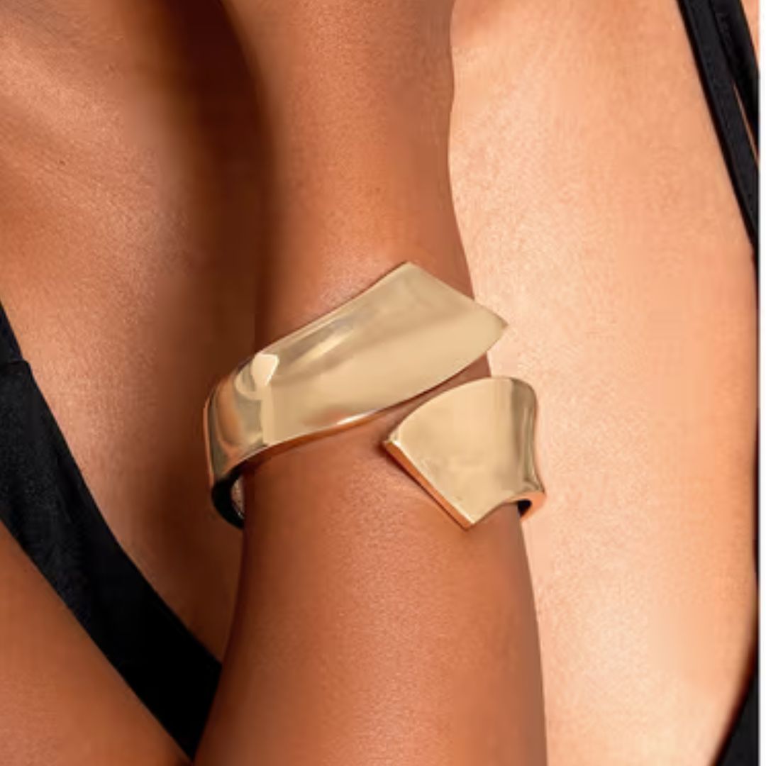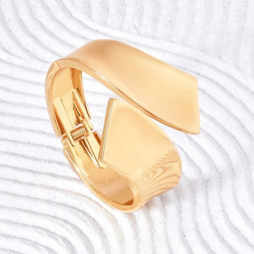 Add a touch of sophistication to your look with this stunning golden solid bangle. Designed with a sculptural, fluid shape, this bracelet makes a bold yet elegant statement. Its smooth, high-shine finish ensures timeless appeal, perfect for those who love effortless luxury.