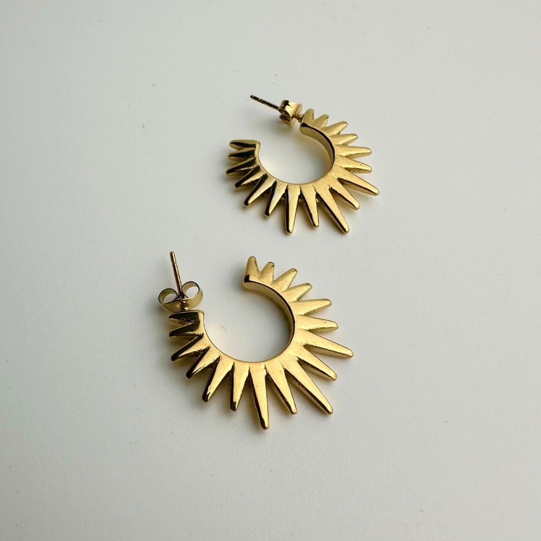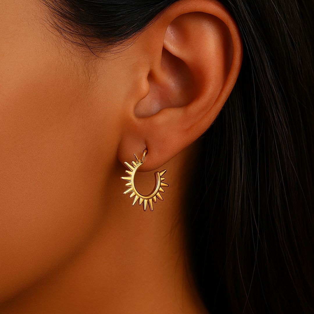Radiate bold energy with the “Little Sunshine ” earrings – a fiery statement piece crafted in glossy gold, shaped like a mini sunrise. The playful, spiked silhouette brings a burst of light to your lobes — perfect for those who carry their own sunshine. Lightweight, tarnish-resistant, and made for the unapologetically radiant soul.