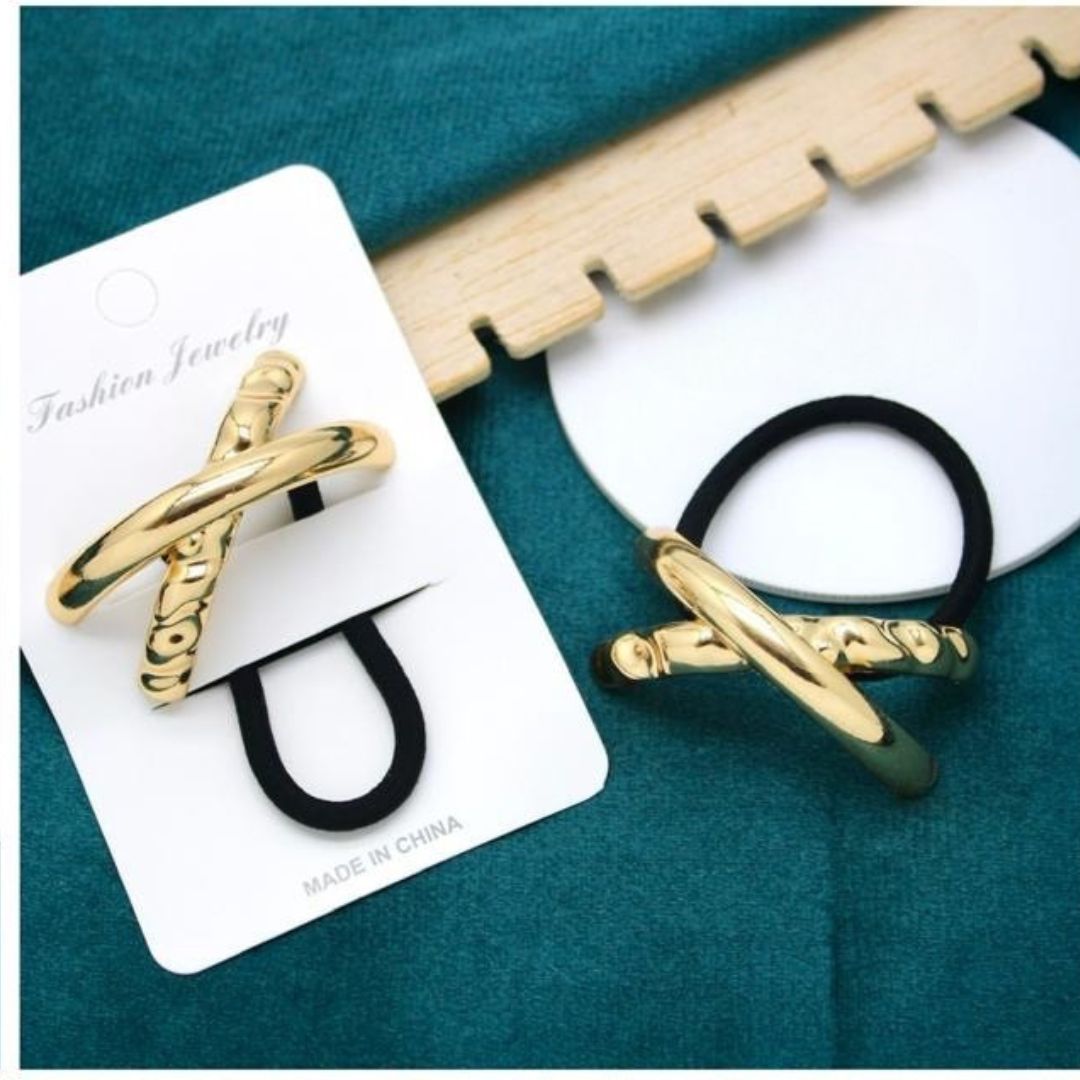 Add a touch of contemporary elegance to your hairstyle with this gold-tone crossover hair tie. Designed with a sleek and artistic crisscross pattern, this accessory effortlessly blends sophistication with a trendy flair, making it a must-have addition to your collection.