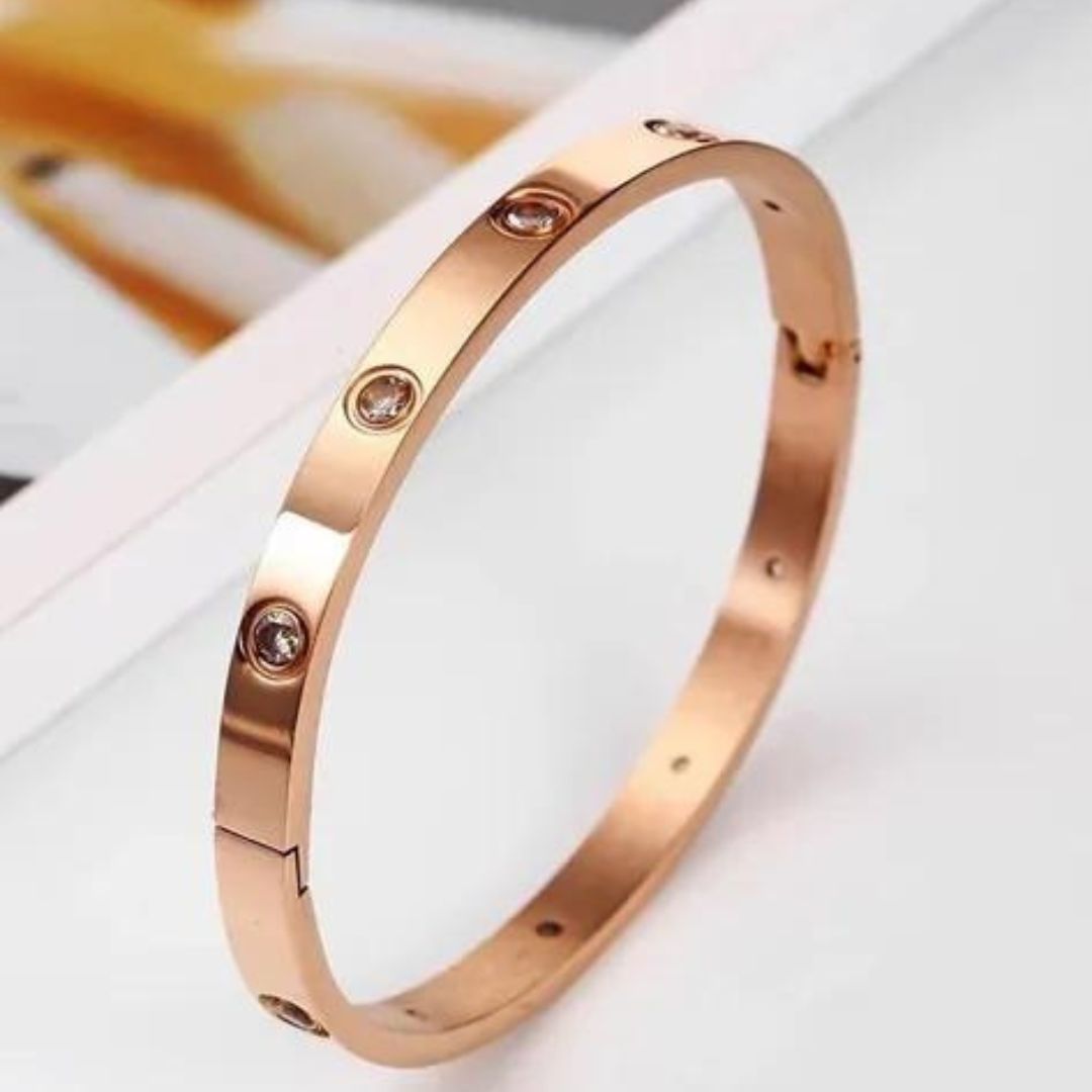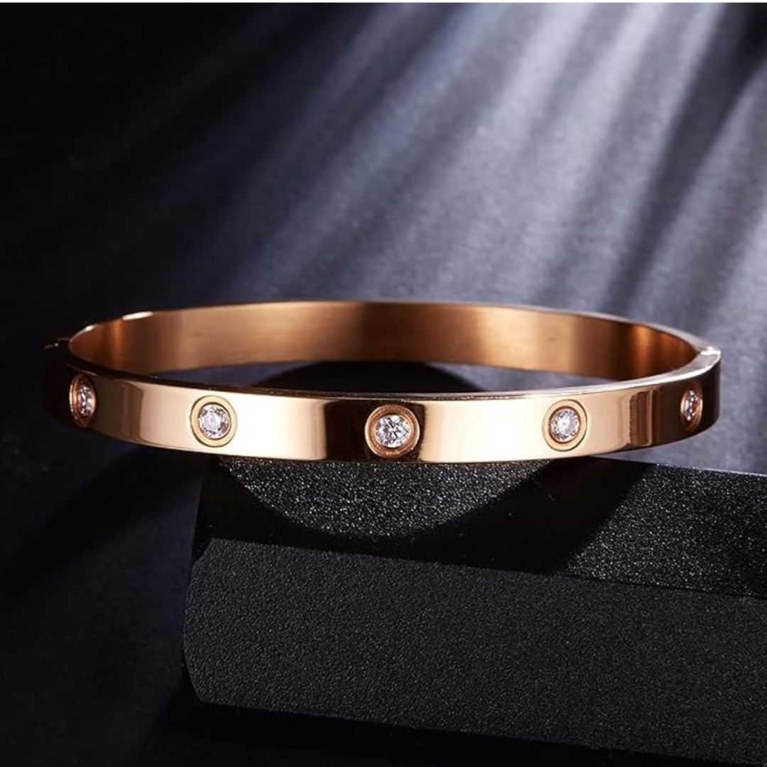 This brand inspired love rose gold plated bangle bracelet has an oval design with top quality Italian cubic zirconia diamond inlay, very classy and absolutely stunning, goes well with any outfit and comfortable for everyday wearing.