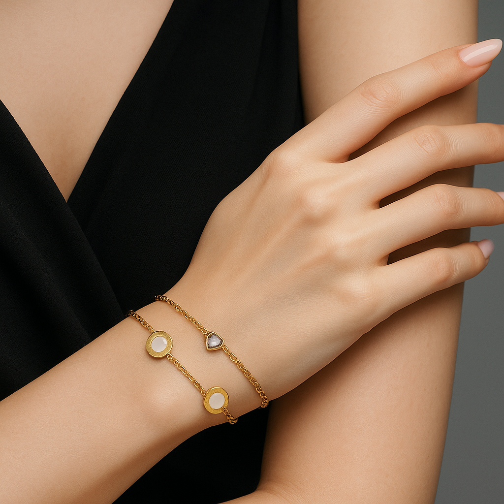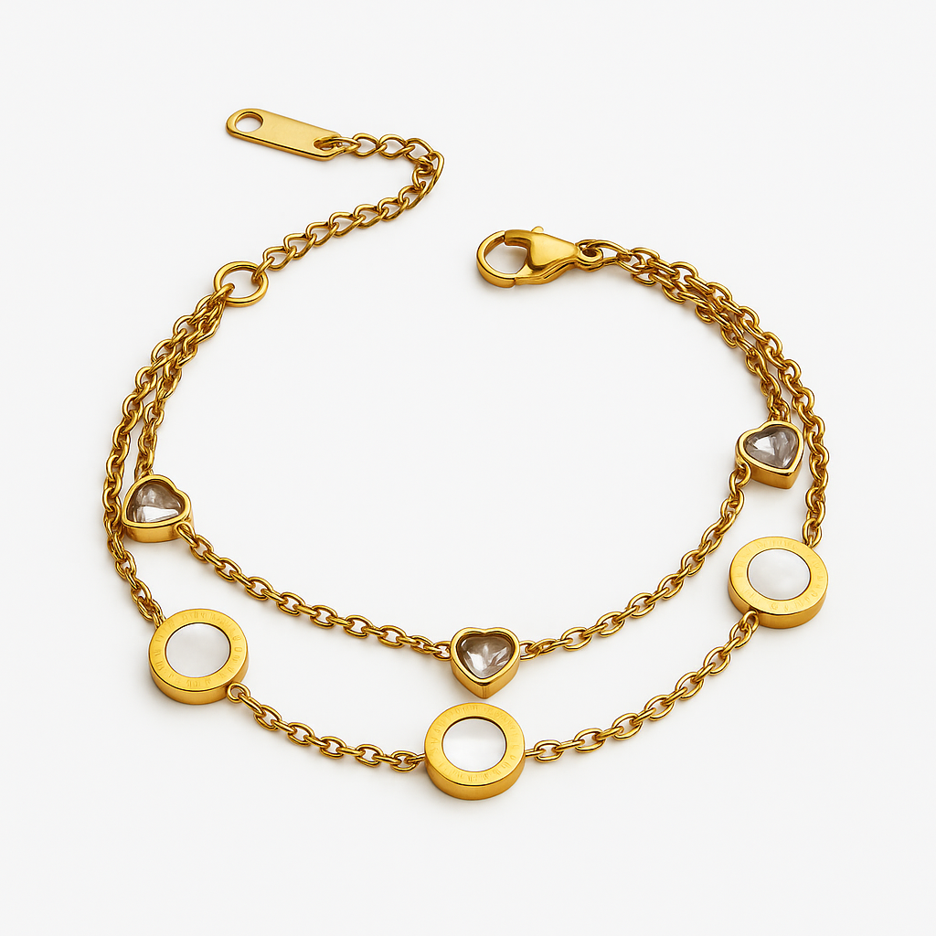 The Eternal Glow Bracelet combines luminous pearl-like circles with sparkling heart charms on a golden double chain. Elegant, versatile, and forever radiant — designed to complement every look, from day to night.