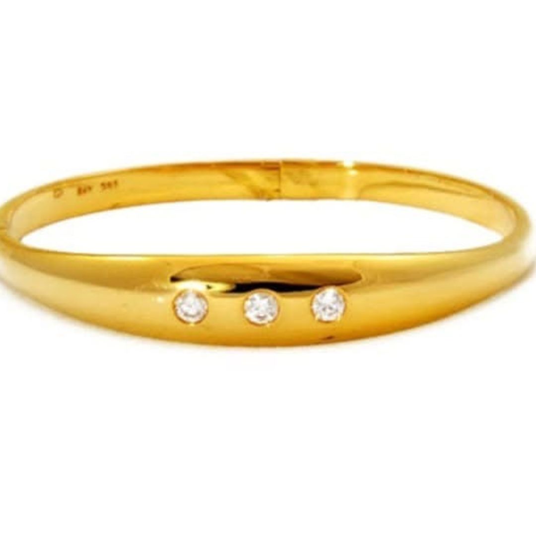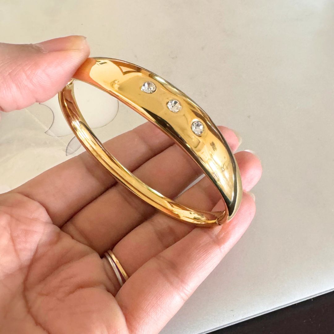 Add a touch of sophistication to your look with this stunning golden solid bangle. Designed with a sculptural, fluid shape, this bracelet makes a bold yet elegant statement. Its smooth, high-shine finish ensures timeless appeal, perfect for those who love effortless luxury.